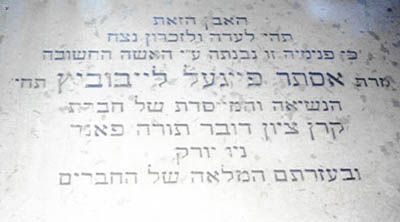 Photo taken in 2000, this plaque is one of many on the wall of the Yeshiva, in Hebrew, both acknowledging and honoring her contributions to Yeshiva Meah Shearim.