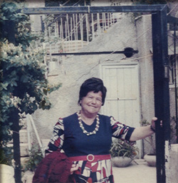 Tova Zusman in front of her house in Sharei Chesed, Jerusalem, 1976.