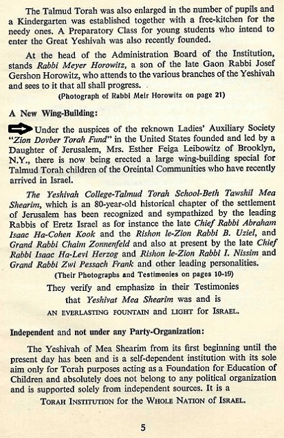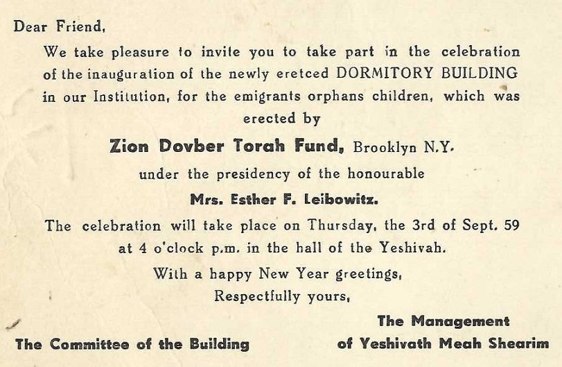 which acknowledges and honors Esther Leibowitz's contributions to Yeshiva Meah Shearim.