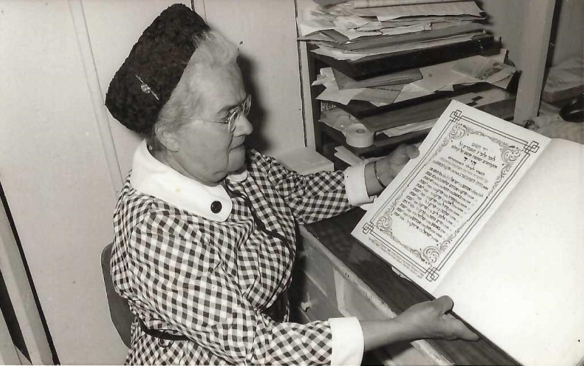Esther Leibowitz standing in front of Yeshiva Meah Shearim.
