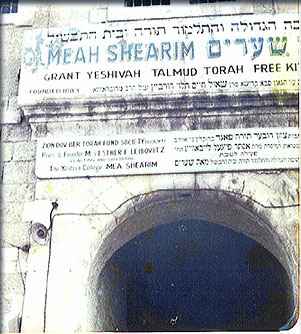 Sign on Yeshiva Meah Shearim, circa 1980.