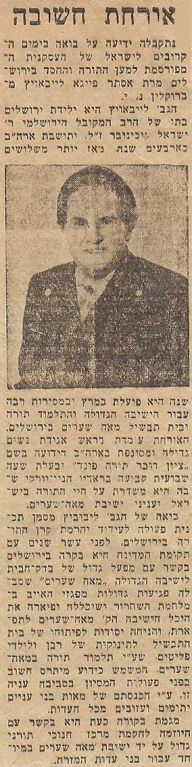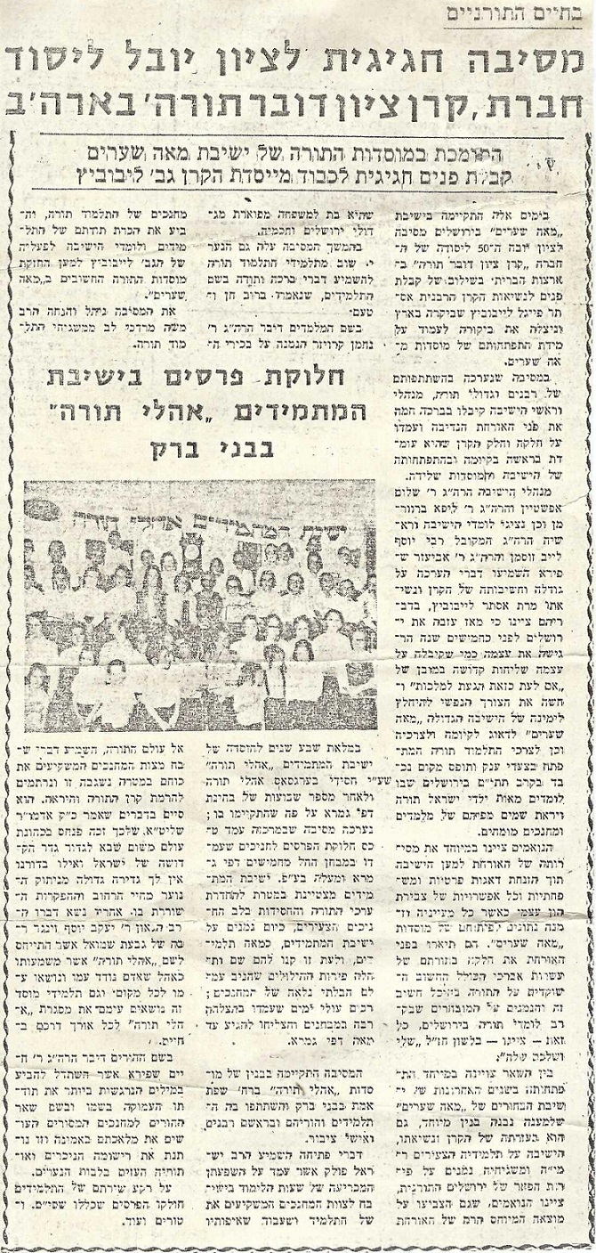 Article about Zion Dov Ber Torah Fund